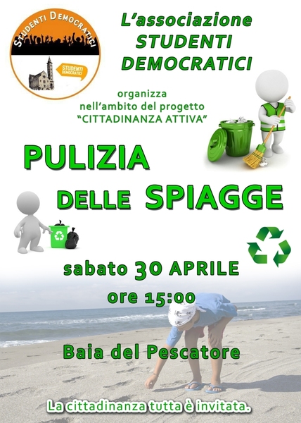 Oggi, sabato 30 aprile, alle 15, l'associazione Studenti democratici, nell'ambito del progetto "Cittadinanza attiva", organizza, presso Baia del pescatore, la pulizia della spiaggia. «Rimbocchiamoci le maniche», è il motto della neonata associazione, che fornirà tutto il materiale necessario a chiunque sarà nelle condizioni di offrire il proprio contributo.