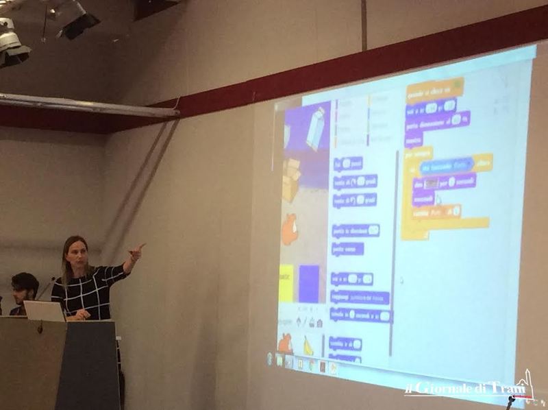 L'insegnante Alessandra Checchia ha magistralmente illustrato ad una sala gremita ed attenta le fasi esecutive e di produzione di un gioco che ha visto coinvolti gli alunni della classe 5^A come programmatori sul software open source "Scratch" che permette di programmare in modo intuitivo e ludico e che, essendo formato da una comunità open, permette di remixare un prodotto già esistente per essere modificato e migliorato.