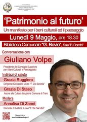Oggi, lunedì 9 maggio, alle 18.30, presso la sala Ronchi della biblioteca comunale di Trani in piazzetta san Francesco il liceo classico, linguistico e delle scienze umane F. De Sanctis di Trani ospiterà Giuliano Volpe, professore ordinario di archeologia presso il Dipartimento di studi umanistici dell’Università degli Studi di Foggia e presidente del Consiglio superiore per i beni culturali e paesaggistici, per una conversazione sul tema della sua ultima opera, “Patrimonio al futuro. Un manifesto per i beni culturali e il paesaggio”.