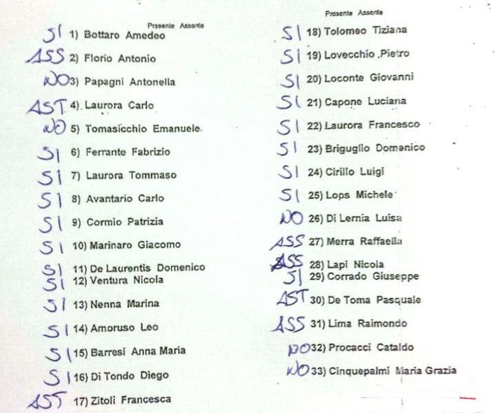 Il 21mo voto favorevole è arrivato dalla minoranza (Beppe Corrado), nelle cui file si sono anche astenuti Carlo Laurora (Ncd) e Pasquale De Toma (Forza Italia). Contrari Tomasicchio ed i gruppi Trani a capo e M5s. Assenti il gruppo Cor e Raimondo Lima (Fdi).