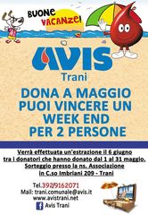 A chi donerà sangue fino al 31 maggio, l'Avis Trani offre la possibilità di vincere un week-end per due persone. È possibile donare tutti i giorni, dal lunedì al sabato, dalle 8 alle 11, presso l'Unità di Raccolta Fissa (ex centro trasfusionale), sita in viale Padre Pio.