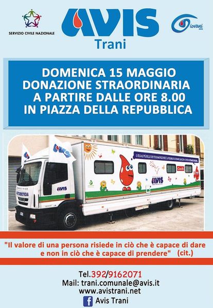 Ai fini dell'estrazione finale, che avverrà lunedì 6 giugno presso la sede dell'associazione in corso Imbriani 209 a Trani, varranno anche le donazioni effettuate durante le due donazioni straordinarie che avverranno nel mese di maggio: quella di oggi, domenica 15 maggio, a partire dalle 8, in piazza della Repubblica, e quella del 22 maggio, presso l'unità di raccolta fissa.