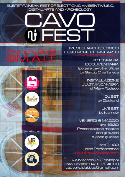 Con questo obiettivo, confermato e rafforzato, il «Festival sotterraneo di musica ambient elettronica, arte digitale ed archeologia» quest’anno esce dai confini della città di Trani. La “Premiere 2016”, che prepara alla nuova “Summer edition” si terrà oggi, venerdì 6 maggio, presso il Museo archeologico degli ipogei di Trinitapoli, in via Marconi 26.