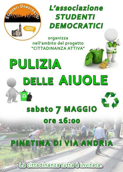 Oggi, sabato 7 maggio, alle 16, l'associazione Studenti democratici, nell'ambito del progetto Cittadinanza attiva, organizza la pulizia delle aiuole di piazza papa Giovanni Paolo II, più comunemente nota come la pinetina di Via Andria.