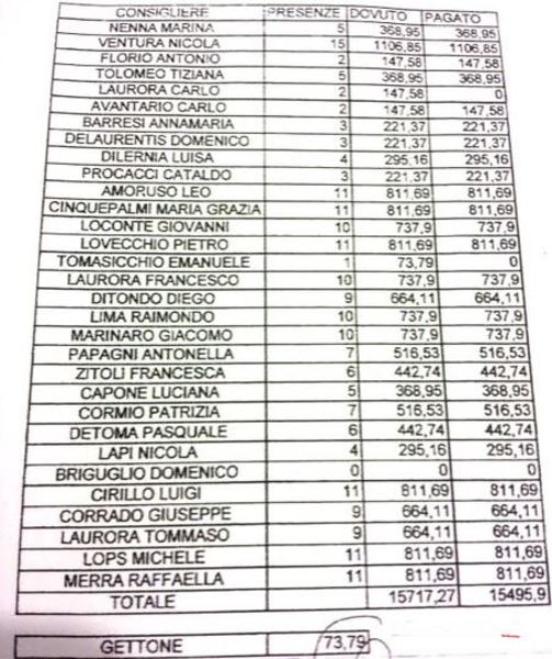 Per quanto riguarda le liquidazioni, nessuno dei consiglieri comunali ha raggiunto, con le sole commissioni, la quota massima liquidabile mensilmente di 1.127 euro (partendo da un gettone di presenza unitario di 73,79 euro e non potendo andare oltre un quarto dell’indennità del sindaco).