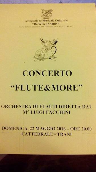 Domenica 21 maggio alle 20 presso la cattedrale di Trani concerto "Flute & more". L'orchestra di 30 faluti, diretta da Luigi Facchini, è composta da ragazzi dai 12 ai 30 anni provenienti dal circondario (zona Bat e Ba).