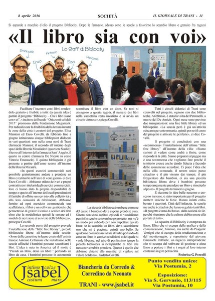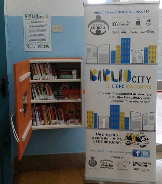 Facilitare l’incontro con i libri, rendendolo gratuito e fruibile a tutti: da questa idea è partito il progetto “Bibliocity – Che i libri siano con voi”, vincitore del bando “Orizzonti solidali 2015” promosso dalla Fondazione Megamark. Per radicalizzare la fruibilità della lettura in tutte le zone della città i creatori del progetto, Elisa Mantoni ed Enzo Covelli, da febbraio fino a giugno istituiranno cinque bibliopoint dislocati in vari quartieri: uno nella zona nord di Trani (farmacia Manno); il secondo all’interno degli spazi della libreria Mondadori (quartiere Stadio); il terzo all’interno della farmacia Sant’Angelo, il quarto in centro (farmacia De Nicolo in corso Vittorio Emanuele). Il quinto bibliopoint è già presente a partire dall’anno scorso all’interno della libreria Miranfù. «In questi esercizi commerciali sarà possibile gratuitamente andare a prendere un libro e restituirlo nell’arco di venti giorni - ci dice Enzo Covelli -. Abbiamo stilato dei veri e propri contratti con i titolari degli esercizi commerciali: loro ci hanno dato la propria disponibilità di tempo e spazio all’interno dei locali prendendosi il fastidio di offrire un servizio alla collettività e alla loro comunità di riferimento. Abbiamo fornito ad ogni esercizio commerciale una scaffalatura, i libri e un software gestionale che permettesse di gestire il carico e scarico dei libri oltre che la modulistica quindi le tessere ed i moduli di iscrizione al servizio della biblioteca» prosegue Covelli.