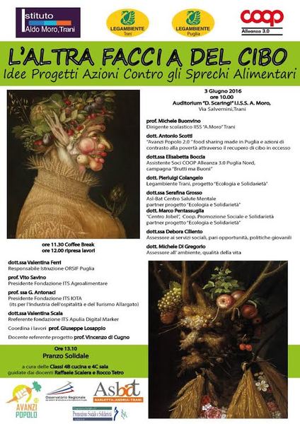 Nel mondo si spreca oltre un terzo del cibo prodotto, di cui l’80% sarebbe ancora consumabile. Cosa si può fare per evitare che questo enorme quantitativo di alimenti diventi un rifiuto da smaltire? Se ne discute a Trani oggi a partire dalle 10presso l'auditorium dell'IISS “A. Moro”. L'indirizzo Alberghiero dell'IISS “A. Moro”, Legambiente Puglia e Circolo di Trani, IperCoop Barletta Coop Alleanza 3.0 insieme al Centro di Salute Mentale della ASL-BAT e al Centro Jobel hanno dato vita al progetto “Ecologia e Solidarietà” che, in 2 anni di attività, è riuscito a recuperare quasi 20.000 € di merci alimentari ancora buone, ma non più vendibili, trasformandole in elemento di aggregazione di una vera rete sociale territoriale tra impresa, scuola, sistema sanitario, mondo del volontariato e del terzo settore.