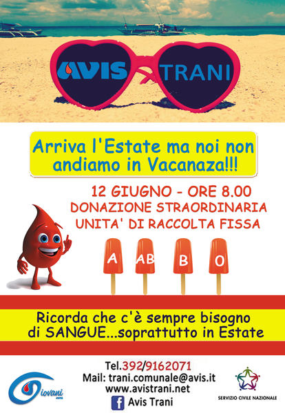 «Arriva l’estate ma noi non andiamo in vacanza. Ricorda che c’è sempre bisogno di sangue, soprattutto in estate»: con questo slogan, l’Avis Trani invita tutti i cittadini a donare il sangue domani, domenica 12 giugno, a partire dalle 8, presso l’unità di raccolta fissa in viale Padre Pio.