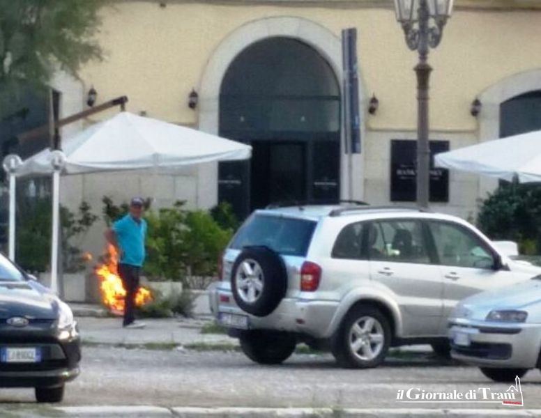 Una scena alquanto insolita si è verificata in piazza Re Manfredi, ieri sera, intorno alle 19, quando un soggetto, presumibilmente uno dei parcheggiatori abusivi che solitamente opera in quella zona, ha dato fuoco ad alcune sterpaglie e cartoni accatastati nei pressi di fioriere e dell'ombrellone di un locale.
