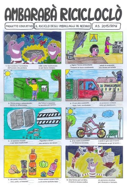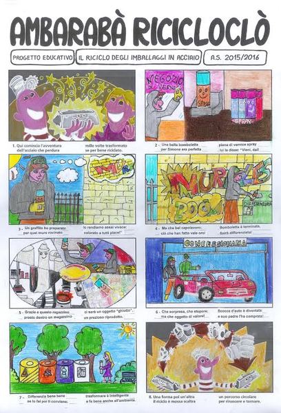Un altro tema, di altra natura ma ugualmente importante, cioè quello del riciclo e recupero dell’acciaio, ha portato gli stessi alunni, sempre guidati dall’insegnante Bruno, alla conquista dell’altro premio di altrettanto valore: il Premio Andersen per gli autori e i protagonisti dell’editoria dell’infanzia, nell’ambito del quale la Terza D del 3° Circolo di Trani ha vinto il concorso “Ambarabà Ricicloclò - La Filastroccola”, iniziativa promossa da RICREA (Consorzio Nazionale Riciclo e Recupero Imballaggi Acciaio), realizzando tre composizioni di brevi storielle in versi ottonari in rima baciata (AA, BB) riccamente illustrati, alla maniera del Signor Bonaventura di Sergio Tofano e di tanti altri personaggi e autori attivi sul Corriere dei Piccoli dei primi del Novecento.