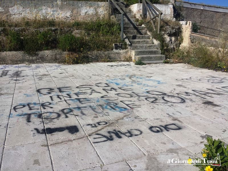Da diversi mesi ormai la terrazza del lungomare Mongelli è un concentrato di bestemmie sacrileghe. Infatti, una serie di pesanti frasi contro la religione cattolica sono state rilasciate con la vernice spray, probabilmente nel periodo pasquale a giudicare da contenuto e tono delle scritte.
