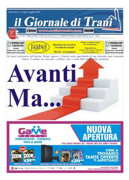 È in edicola il nuovo numero de Il giornale di Trani, dal titolo «Avanti ma...», con riferimento al bilancio appena approvato in consiglio comunale. Nel primo anniversario dell'elezione, Bottaro approva il bilancio anche approfittando di una minoranza quasi inesistente. Tuttavia, il sindaco non nasconde i problemi, pure a causa della nuova bufera giudiziaria.