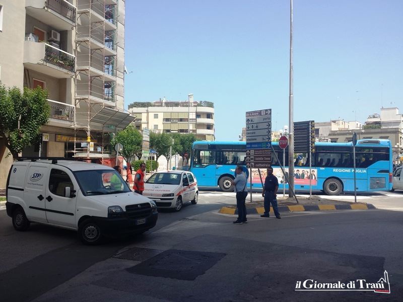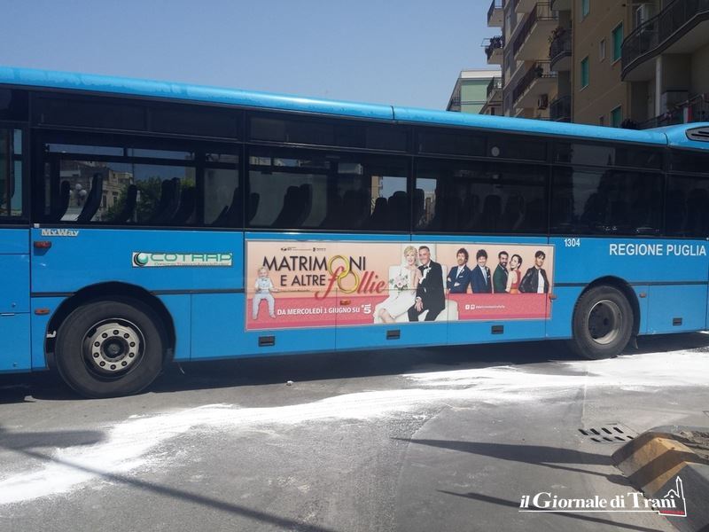 Il mezzo pubblico è rimasto fermo all'incrocio tra la stessa piazza e le vie per Andria e Barletta e, a distanza di pochi minuti, personale dell'azienda era già sul posto insieme con gli operatori dell'associazione Trani soccorso, per lo spargimento di materiale utile al drenaggio dell'olio disperso.