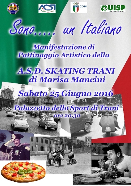 La società sportiva "Skating Trani", di Marisa Mancini, organizza la manifestazione di pattinaggio artistico "Sono... un italiano", in programma oggi, sabato 25 giugno, alle 20.30, presso la pista esterna del PalaAssi. Gli atleti, attraverso un mix musicale, tra passato e presente, daranno vita ad uno spettacolo sull’essere italiani. La cittadinanza è invitata.