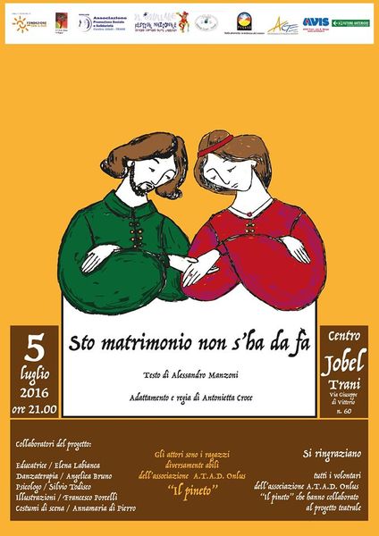 Dopo la grande apertura di ieri con lo spettacolo “I’m migrant” a cura della fondazione Opera santi medici Cosma e Damiano e dell’associazione culturale “Fatti d’arte” di Bitonto, stasera alle 21 al centro Jobel in via Di Vittorio 60 secondo appuntamento fuori concorso del festival nazionale “Il giullare, teatro contro ogni barriera”, dal titolo “ ’Sto matrimonio non s’ha da fa’ ”.