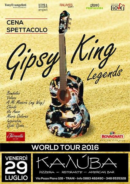 Oggi, venerdì 29 luglio, alle 21.30, al Kayub, in via Pozzo piano 128, cena spettacolo con i Gipsy King legends. Un grande evento che si terrà nella cornice del Kayuba - pizzeria, ristorante e american bar - per il world tour 2016 del gruppo, che canterà i suoi grandi successi quali "Bamboleo", "Volare", "A mi manera (my way)", "Chiribi", "Un amor", "Maria Dolores", "Inspiration", "Djobi djoba".