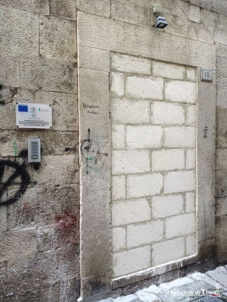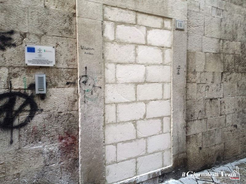 Inizialmente, avevamo scritto che l'accesso murato era uno solo. In realtà, dalla ditta "Meda restauri" di Trani ci fanno sapere che le porte murate sono state due. Infatti, oltre a quella che vedete in foto ce n'è un'altra attraverso la quale entrare, facilmente raggiungibile penetrando da altri varchi (ad esempio, arrampicandosi sui balconi adiacenti). Inoltre, il titolare dichiara che sta aspettando che il Comune dia alla sua azienda il compenso dovuto.