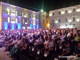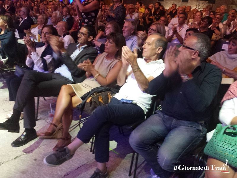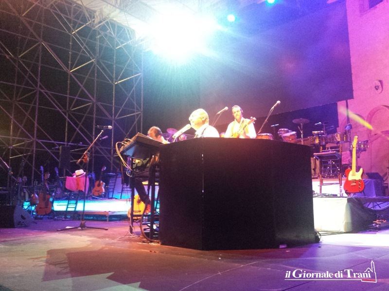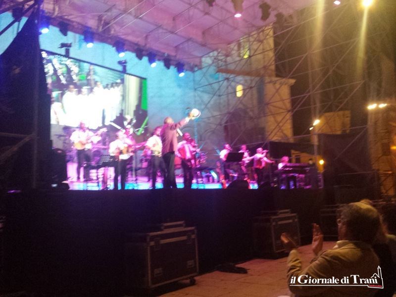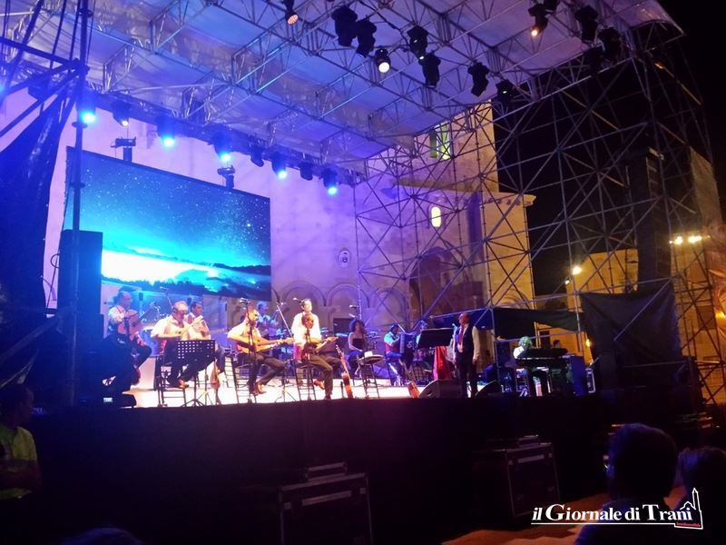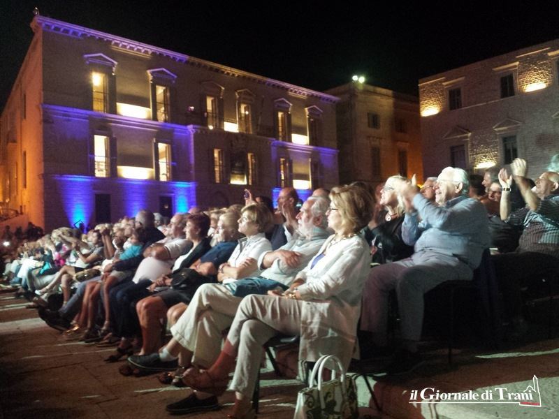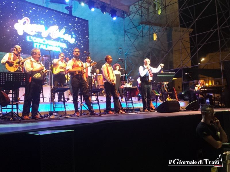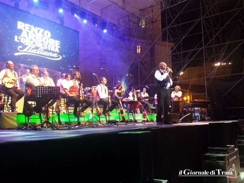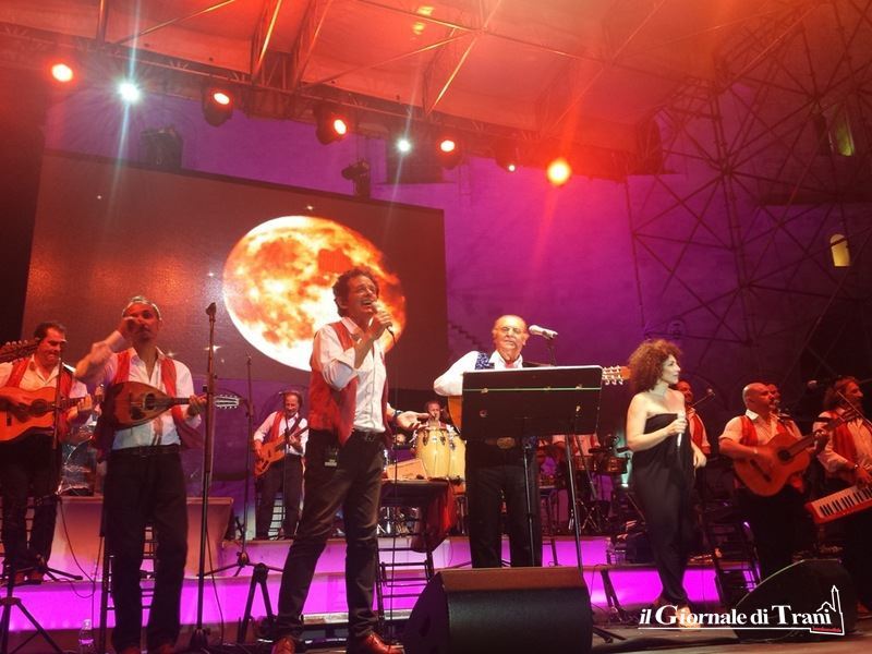 Sulle note di Reginella e le foto di Roberto Murolo, cui ha sempre dedicato il brano sigla dei suoi concerti, Renzo Arbore è entrato in scena levandosi il cappello, “perché Trani è Trani e questa serata, in questo posto, è davvero magica”.