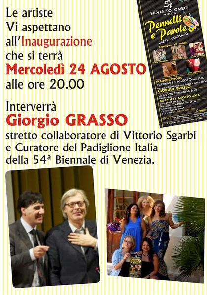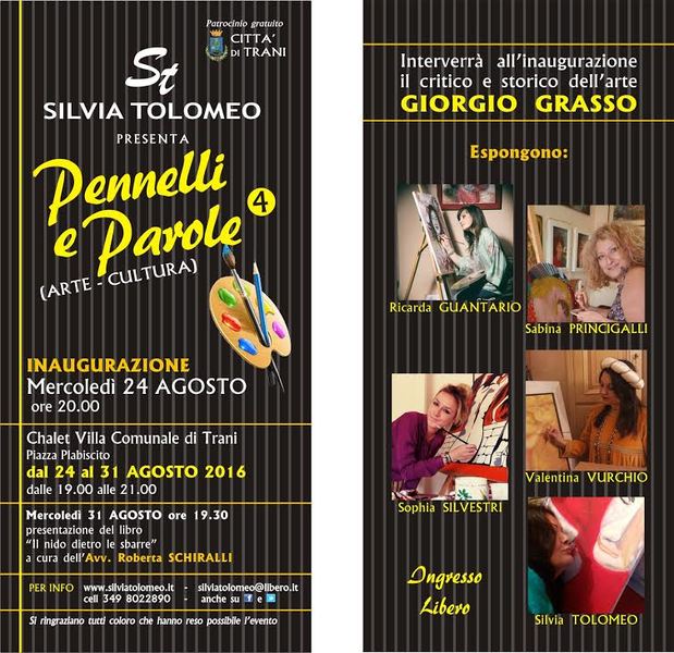 Nell'ambito delle mostre dell'Estate tranese 2016, a cura dell'assessorato alla cultura, allo chalet della villa comunale, prosegue “Pennelli e parole”, mostra curata da Silvia Tolomeo e patrocinata dal Comune di Trani. Oltre la pittrice e curatrice dell'evento, espongono le artiste Ricarda Guantario, Sabina Princigalli, Valentina Vurchio e Sophia Silvestri.