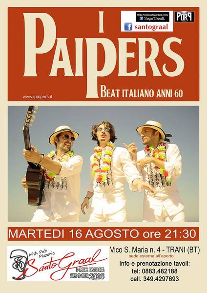 Stasera, martedì 16 agosto, alle 22, nello spazio esterno all'aperto del Santo Graal di Trani in vico Santa Maria 4, per la rassegna "Music events summer 2016", accolti dal fascino del borgo antico in una atmosfera unica, "I Paipers".