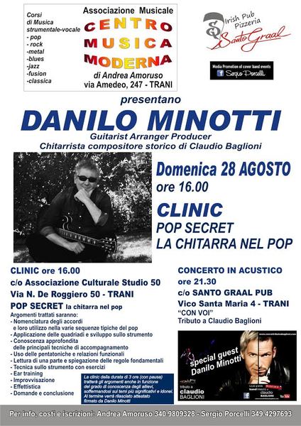 Ospite della Città di Trani per la prima volta Danilo Minotti chitarrista compositore di Cludio Baglioni per due appuntamenti che lo vedranno protagonista nella giornata di oggi, domenica 28 agosto.