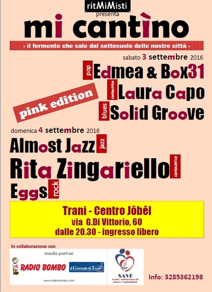 Oggi, domenica 4 settembre, al centro Jôbêl, in via Di Vittorio 60, si conclude la nona edizione del festival “Mi cantìno”, a cura dell'associazione Ritmi misti, dedicato alle donne. Oggi sarà la volta degli Almost Jazz e del rock esplosivo degli Eggs.