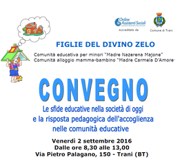 Oggi, venerdì 2 settembre, a partire dalle 8.30, la comunità educativa e la comunità mamma-bambino delle figlie del divino zelo di Trani organizzano il convegno dal titolo "Le sfide educative nella società di oggi e la risposta pedagogica dell'accoglienza nelle comunità educative" accreditato dall'ordine regionale degli Assistenti sociali e patrocinato dal Comune di Trani.