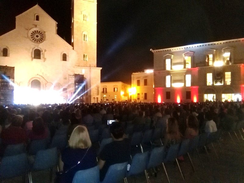 Le campane della cattedrale di Trani hanno suonato quattro volte ogni ora, scandendo involontariamente, per un attimo anche il numero di brani con i quali la cantautrice ha partecipato a Sanremo. E proprio per scegliere due delle quattro canzoni da interpretare, la cantante ha fatto "sorteggiare" i brani da altrettante persone presenti tra il pubblico.