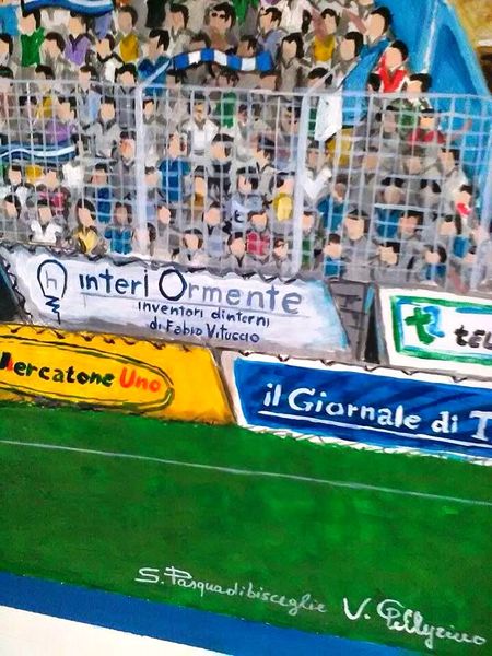 Nella raffigurazione anche una serie di cartelloni pubblicitari, tra i quali quello del nostro Giornale di Trani. Si tratta di una scelta esclusiva dei supporter biancazzurri, che ringraziamo di cuore per il gentile pensiero, segno di un riconoscimento della costante presenza e del lavoro della nostra testata a favore dello sport, del calcio, del Trani e della sua tifoseria.