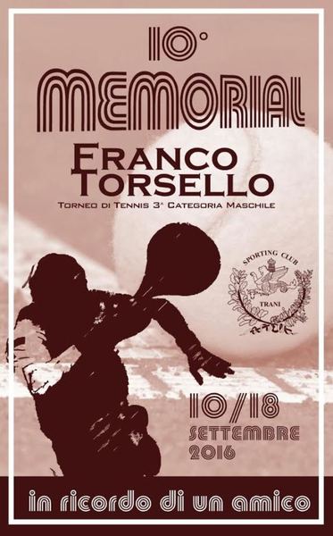 Il torneo "Fit", terza categoria maschile del dedimo memorial Franco Torsello si è giocato sui campi dello Sporting Club Trani dal 10 al 18 settembre, con la partecipazione di oltre 70 "racchette", e si è concluso ieri mattina con due belle finali: la finale del tabellone di terza categoria è stata vinta da Luigi Bianchi, tesserato con lo Sporting Club Trani, che si è aggiudicato il titolo con il punteggio di 7-6, 6-2 su Marco Biancardino del Tennis Club Foggia.