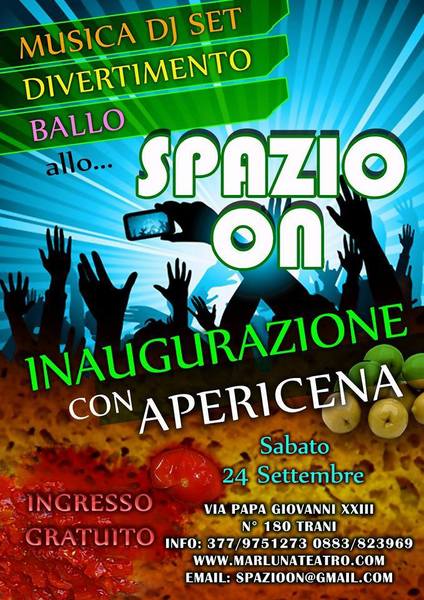 Oggi, sabato 24 settembre, a partire dalle 21 in via papa Giovanni XXIII 180, a Trani, inaugurazione dello "Spazio on" a cura di "Marluna teatro". È prevista un'inaugurazione con apericena, musica dj set, divertimento e ballo. Per informazioni, marlunateatro.com - 3779751273 - 0883823969 - spazioon@gmail.com. Ingresso gratuito.