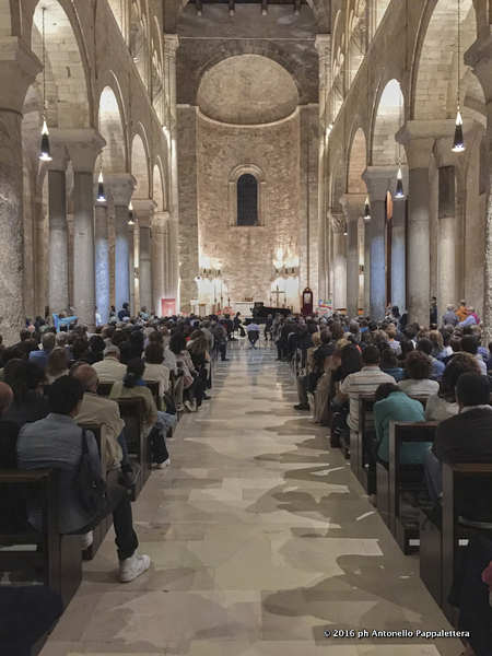 Così Ramin Bahrani, presentando il concerto tenuto ieri sera in cattedrale, in una basilica completamente gremita, per l'atto di chiusura dei Dialoghi di Trani. L'artista ha alternato momenti al pianoforte con altri in cui ha parlato al pubblico dell'autore da lui eseguito, delle sue esperienze musicali e, soprattutto, del coinvolgimento che la cultura dovrebbe sempre operare su di noi: «Usciamo da l'individualismo nel quale siamo caduti anche per colpa dei social network - ha detto il Maestro -. Stare qui insieme, questa sera, in questa splendida chiesa, è quanto dovremmo sempre fare per condividere non sui social, ma esperienze vive tra noi».