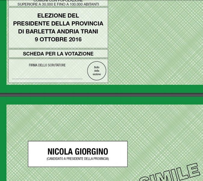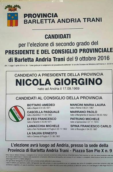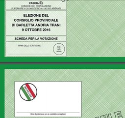Oggi, domenica 9 ottobre, dalle 8 alle 20, i Sindaci ed i Consiglieri comunali dei dieci Comuni della Provincia di Barletta - Andria - Trani saranno chiamati alle urne per l’elezione di secondo grado del Presidente e dei componenti del Consiglio della Provincia di Barletta - Andria - Trani. Il seggio elettorale sarà ubicato presso la sede dell'Amministrazione provinciale in Piazza San Pio X, n. 9 ad Andria.
