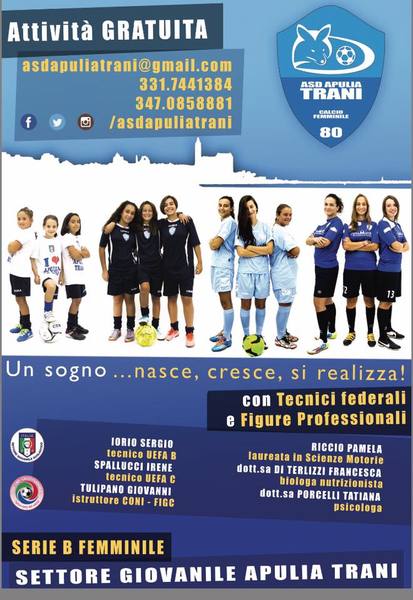 Le attività dell’Apulia Trani sono completamente gratuite. La squadra inoltre, nel corso di questi anni ha avviato corsi, anch’essi totalmente gratuiti, di calcio femminile nelle scuole elementari, medie e superiori del territorio, e si appresta ad allargare il proprio campo d’azione a qualsiasi dirigente scolastico voglia integrare le attività curriculari con quelle sportive. Per iscriversi o chiedere informazioni, basta chiamare i numeri 3317441384 o 3470858881. Per conoscere le attività dell’Apulia Trani, inviare una mail a asdapuliatrani@gmail.com, o visitare le pagine social Facebook.com/apuliatrani, Instagram/asdapuliatrani e Twitter.com/asdapuliatrani.