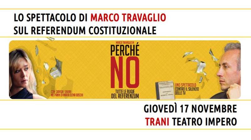 Marco Travaglio sarà a Trani con "Perché no. Uno spettacolo contro il silenzio delle tv", con Travaglio e Giorgia Salari. La voce era già circolata nelle scorse settimane, ed oggi si sa che Travaglio porterà in scena, presso il cinema teatro Impero oggi, giovedì 17 novembre, alle 21, il suo spettacolo teatrale. L'evento è stato promosso dagli attivisti del Movimento 5 stelle di Trani e organizzato dall'Impero.