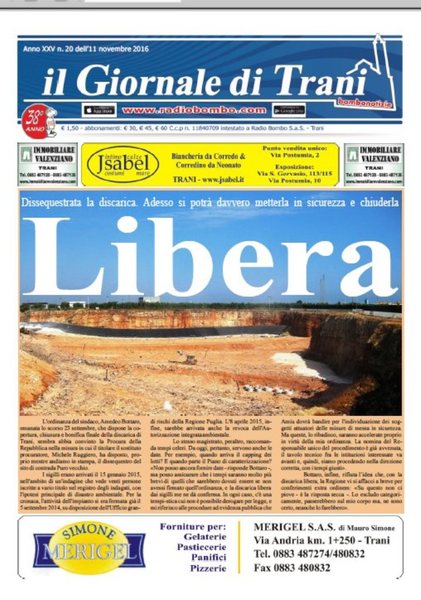 È «libera» la discarica di Trani, dissequestrata ma ancora fucina di problemi. Da questo titolo parte il nuovo numero de «Il giornale di Trani», in edicola a 1 euro e 50. Su questo numero abbiamo trattato argomenti di stringente attualità che riguardano la vita amministrativa della città, con i consueti approfondimenti di cultura e sport. Per informazioni, contattare la nostra testata tramite email (segreteria@radiobombo.com) o tramite contatto telefonico (0883.482700).