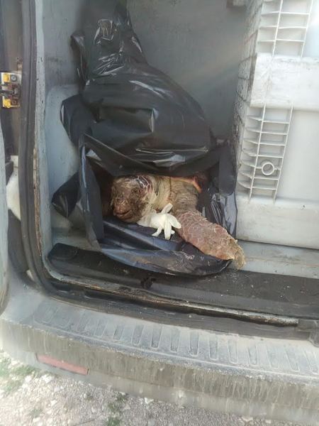 L'animale, in incipiente stato di decomposizione, non è sembrato presentare, a vista, ami conficcati o traumi che ne abbiano causato la morte.