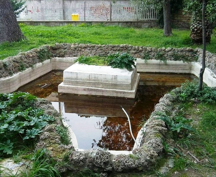 Il giardino è in stato di totale abbandono: erbacce alte, moscerini e zanzare nei pressi della vasca ornamentale colma di acqua piovana marrone e putrida.