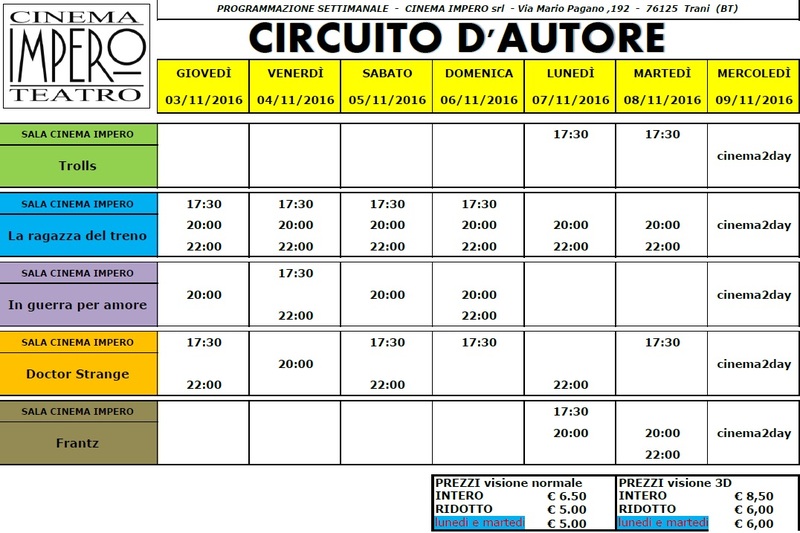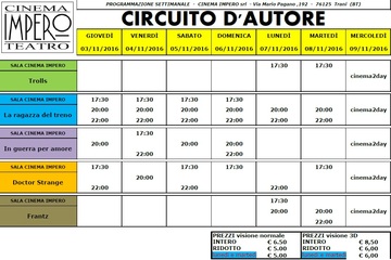 Di seguito la programmazione settimanale del cinema Impero di Trani, in via Mario Pagano 192.