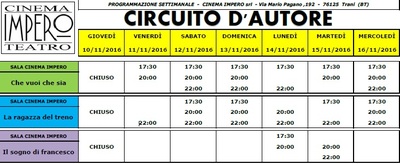 Di seguito la programmazione settimanale del cinema Impero di Trani, in via Mario Pagano 192.