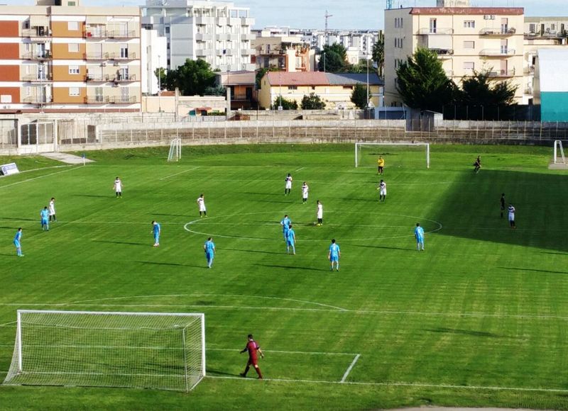 Taranto intimorito, Trani vivacissimo e partita estremamente equilibrata. La formazione ospite spinege soltanto nella parte finale del primo tempo, riuscendo a guadagnarsi al 42’un calcio di rigore per fallo di Ciaramitaro su Santamaria: Pisano va sul dischetto, Moschetto para, ma raccoglie la ribattuta e segna. Si va al riposo sull’1-1.