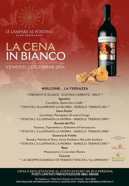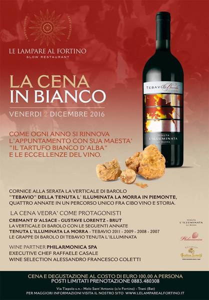 Oggi, venerdì 2 dicembre, si rinnova a Le Lampare al Fortino di Trani l’atteso appuntamento con “La Cena in Bianco” e i due preziosi doni della natura, il vino e il tartufo bianco.
