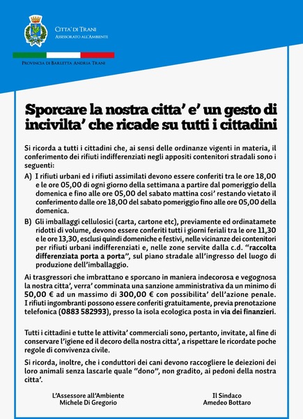 I rifiuti urbani ed i rifiuti assimilati devono essere conferiti tra le ore 18 e le ore 5 di ogni giorno della settimana a partire dal pomeriggio della domenica e fino alle ore 5 del sabato mattina. Resta vietato il conferimento dalle ore 18 del sabato pomeriggio fino alle ore 5 della domenica.