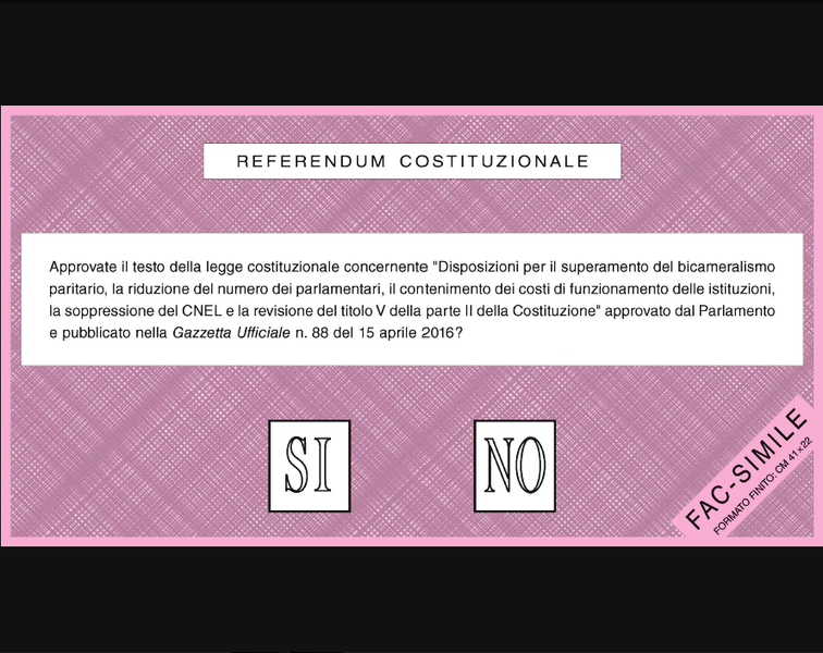 Oggetto della consultazione è il referendum, ex art. 138 della Costituzione, per l'approvazione del testo della legge costituzionale concernente «Disposizioni per il superamento del bicameralismo paritario, la riduzione del numero dei parlamentari, il contenimento dei costi di funzionamento delle istituzioni, la soppressione del Consiglio nazionale economia e lavoro e la revisione del titolo V della parte II della Costituzione», approvato dal Parlamento e pubblicato nella Gazzetta Ufficiale numero 88 del 15 aprile 2016. Si potrà votare dalle 7 alle 23 della sola giornata di questa domenica, 4 dicembre.