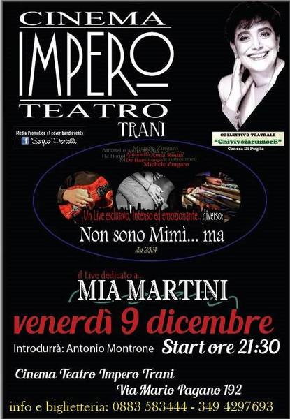 “Non sono Mimì… ma”. Si terrà al cinema teatro Impero di Trani oggi, venerdì 9 dicembre, alle 21.30 il live dedicato a Mia Martini, un momento musicale in cui immergersi nelle atmosfere di un repertorio che, senza ombra di dubbio, ha fatto la storia della musica leggera italiana. Il trio è composto da Anna Rodia alla voce; Antonello De Bartolomero pianoforte e livekey; Michele Zingaro alle chitarre. Introdurrà Antonio Montrone, past president del teatro “Mimesis” di Trani e presidente del “Forum degli autori” di Corato, nonché vicepresidente del collettivo teatrale “Chivive farumore” di Canosa di Puglia.