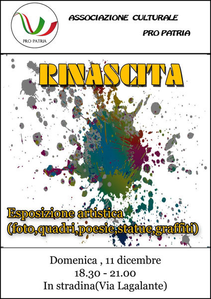 L'associazione culturale "Pro patria" di Trani annuncia il nuovo evento artistico/culturale promosso ed organizzato dai suoi aderenti, denominato "Rinascita", che sarà principalmente caratterizzato da una esposizione artistica di quadri, foto, graffiti, poesie ed altre opere concernenti il tema proposto dall'associazione.