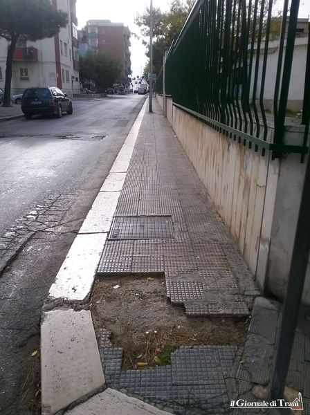 Infine, più avanti, all'intersezione con via Monsignor Petronelli, sul marciapiede adiacente alle mura perimetrali dell'omonima scuola non ci sono più i mattoncini della pavimentazione, creando anche qui potenziali pericoli, soprattutto in considerazione del fatto che ci si trova, come si è detto, in prossimità di una scuola.