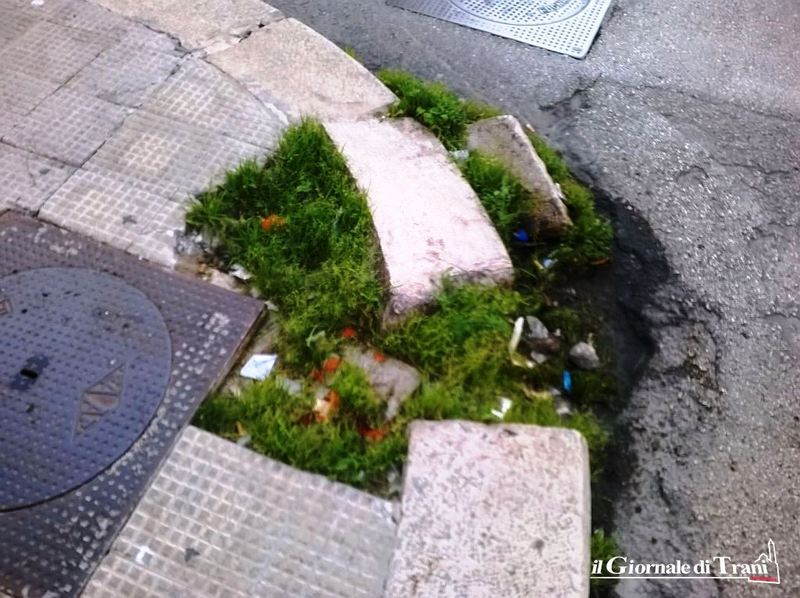 Il marciapiede sinistro, comunque, non se la passa di certo meglio. Alla confluenza con via Amedeo, infatti, uno dei mattoni che costituiscono il cordolo del marciapiede si è completamente staccato dalla sua sede, finendo, semidistrutto, sul piano stradale. Peraltro, nello spazio che si è venuto conseguentemente a creare sta crescendo abbondante l'erba, occultando così il pericoloso dislivello.