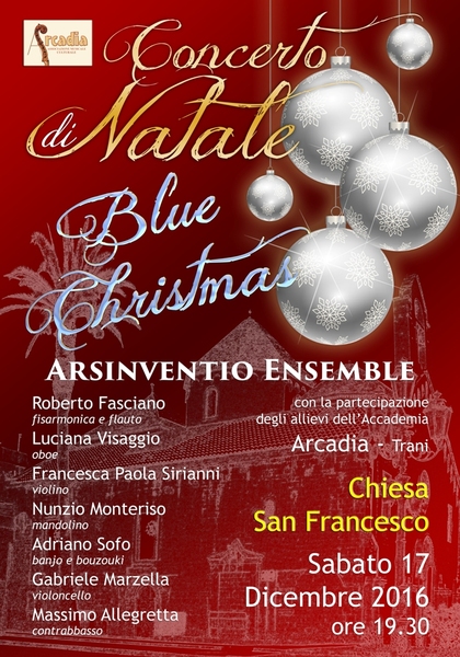 Arsinventio Ensemble sarà protagonista del Concerto di Natale "Blue Christmas". L'appuntamento è per domani, sabato 17 dicembre, ore 19,30, presso la Chiesa San Francesco. Durante l'evento, organizzato dall'Associazione Musicale e Culturale Arcadia, sarà eseguito un programma variegato di brani tratti dal repertorio classico e popolare.
